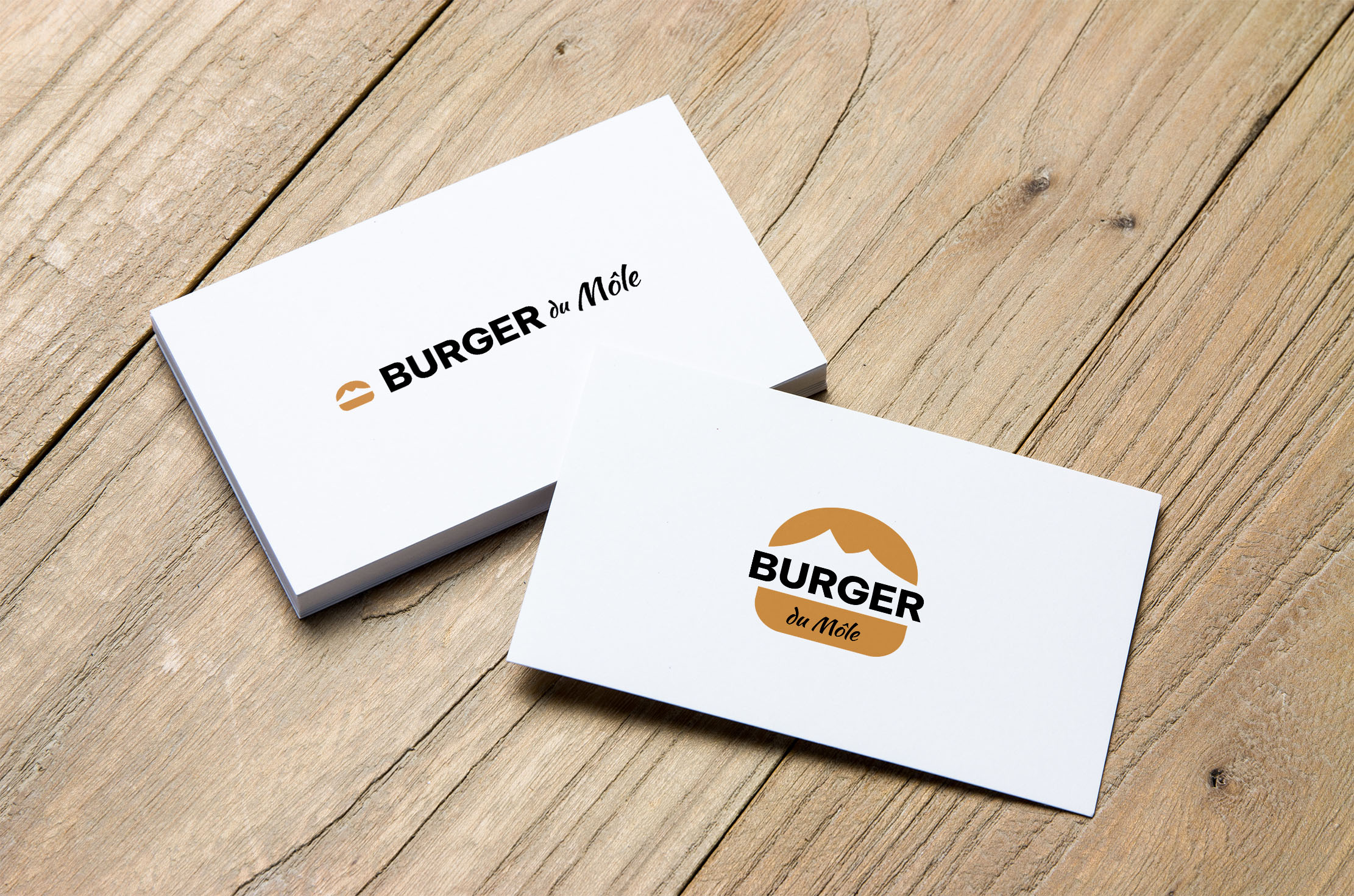 Le restaurant est situé dans une rue parmis de nombreux concurrents directs (kebabs, pizzerias, tacos…). Il était important de faire apparaitre la spécialité du Burger du Môle au premier coup d’oeil, tout en rendant le logo unique.