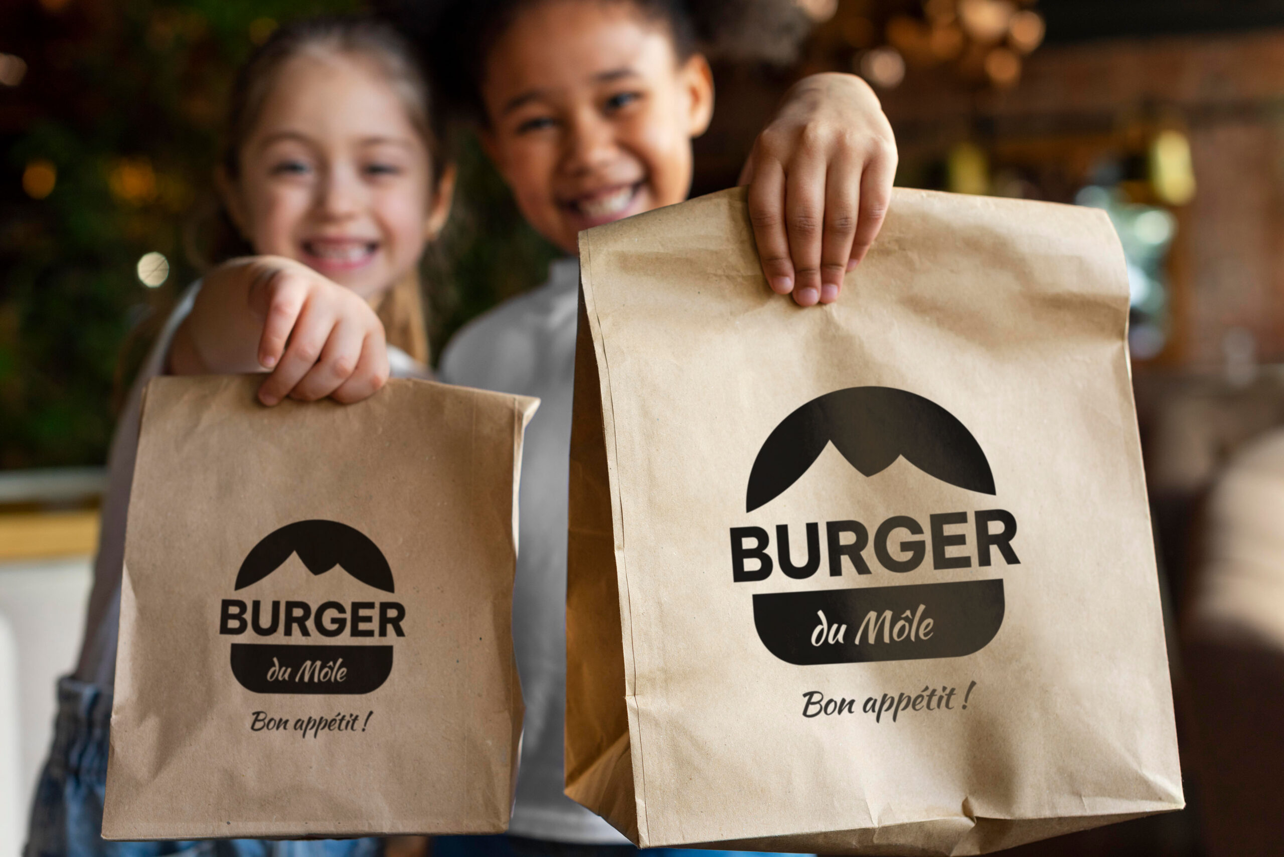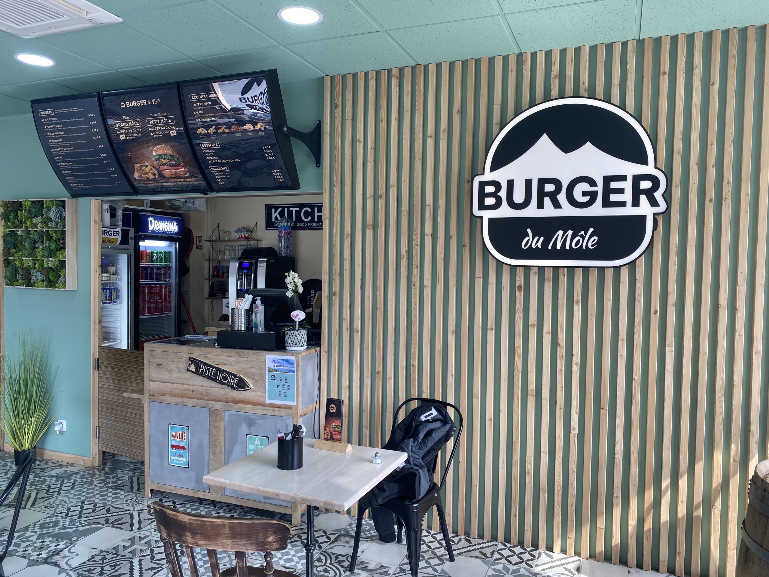 Une typographie manuscrite l’accompagne, exprimant le côté artisanal et authentique des burgers du Môle.