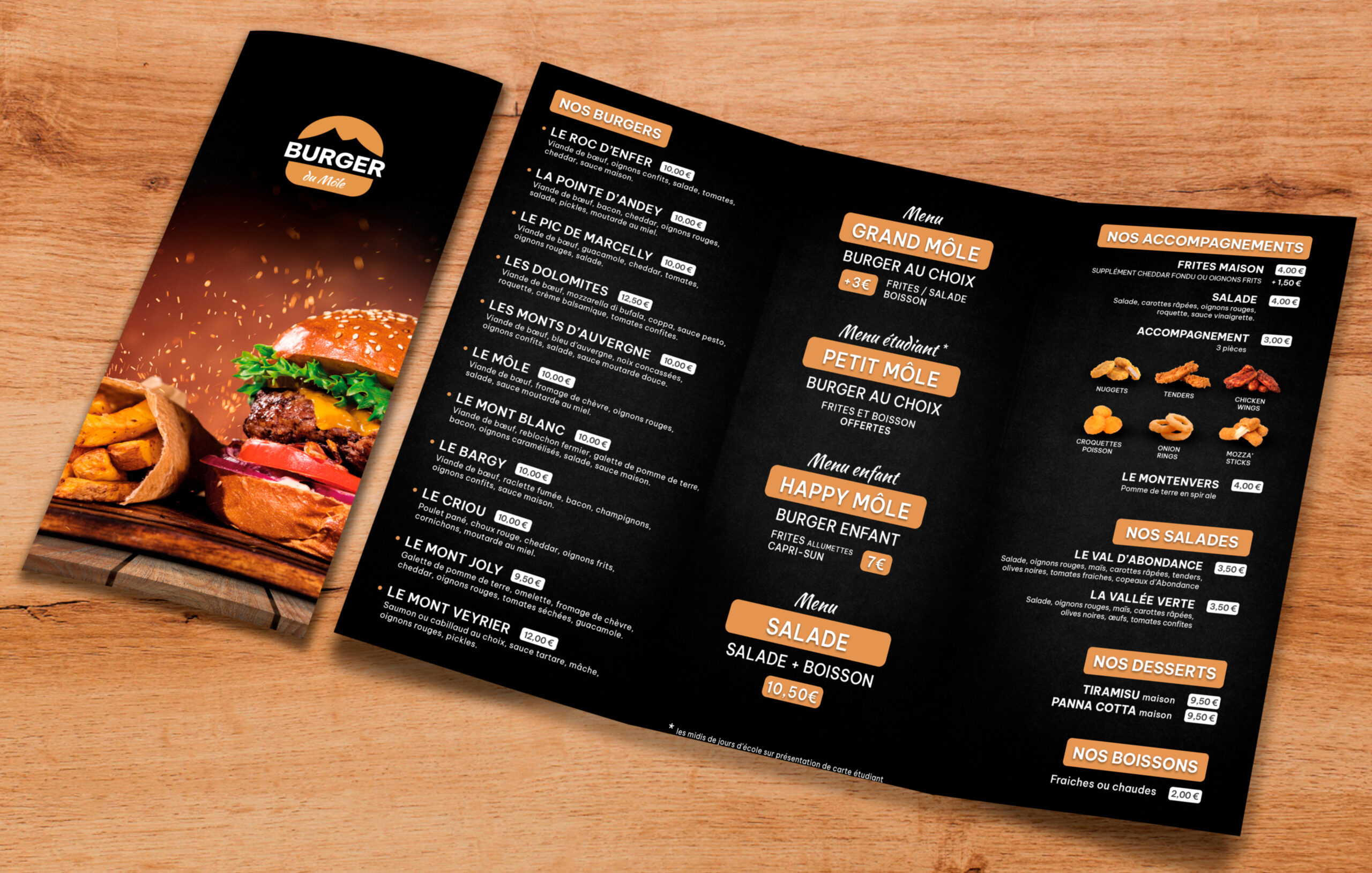 Les commandes faites au serveur rendent impérative la présence d’un menu sur les tables. J’ai opté pour un format dépliant en 3 volets pour garder une cohérence avec les panneaux et un papier épais pour appuyer la perception de qualité auprès des clients.